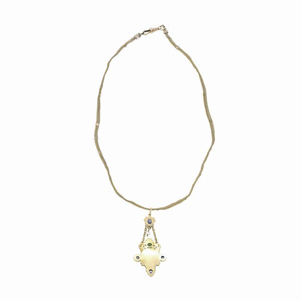 Girocollo con pendente in oro giallo, zaffiri, smeraldi e smalti policromi