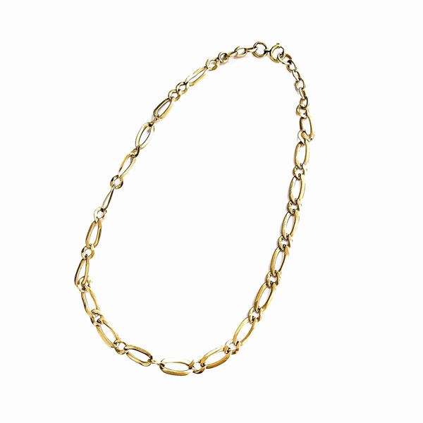 MATERIALE: ororosa e oro giallo DESCRIZIONE: girocollo realizzato con catena a maglie ovali piatte alternate a maglie circolari, il moschettone in oro giallo reca il marchio 750 MISURE: aperto cm 36.5 PESO: gr 12.5