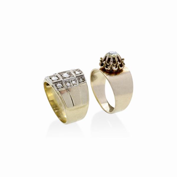 MATERIALE: oro a basso titolo e diamanti DESCRIZIONE: anello a fascia impreziosito con rose di diamante disposte in modo parallelo ed un'altro, sempre a fascia, con rosa di diamante su alta base che ricorda un fiore MISURE: rispettivamente 14 e 15 PESO: gr 13.1