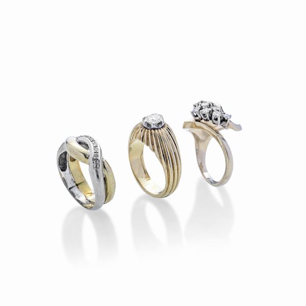 Lotto di tre anelli in oro giallo, oro 14kt e diamanti