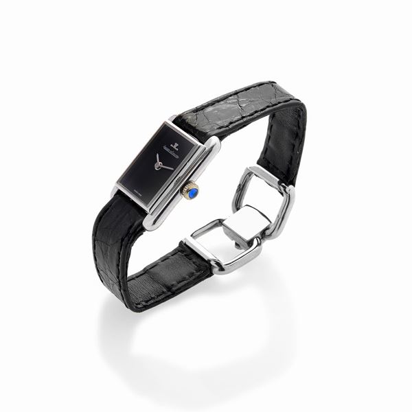 MATERIALE: oro bianco DESCRIZIONE: orologio da signora con cassa rettangolare in due corpi, fondello a scatto, ghiera liscia bombata, corona con zaffiro cabochon, quadrante in smalto nero, lancette a bastone, movimento a carica manuale, cinturino in pelle nera e fibbia in oro bianco recante punzone 750 MISURE: cassa mm 19x26.5