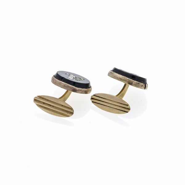 Paio di gemelli in oro giallo e micromosaico con colomba