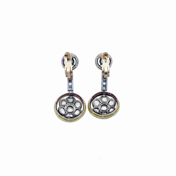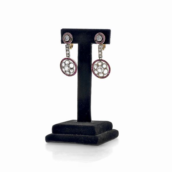 MATERIALE: oro a basso titolo, argento, rubini e diamanti DESCRIZIONE: Paio di orecchini pendenti ciascuno realizzato con una rosa di diamante rotondo taglio vecchio montato entro doppio castone ad anello traforato in oro bianco ed oro giallo decorato da una linea di rubini, a cui è sospeso, tramite un segmento impreziosito da quattro rose di diamante, una corolla formata interamente da rose, anch'essa inscritta entro un anello decorato da una linea di rubini, tre rubini mancanti MISURE lunghezza cm 4,6 PESO: diamanti ct 2.10, colore H-I, purezza SI, g 13,8