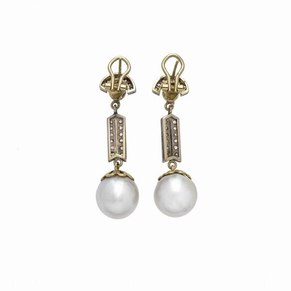 Paio di lunghi orecchini pendenti in oro giallo, argento, diamanti e perle