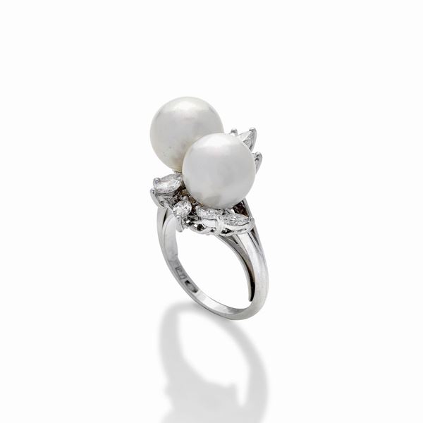 MATERIALE: platino, oro bianco, diamanti e perle coltivate DESCRIZIONE: parure composta da paio di oreccchini a clips, ciascuno realizzato con due perle impreziosite con diamanti taglio navette e un anch'esso con due perle illuminate con diamanti taglio navette, recano il marchio PT MISURE: orecchini cm 2 x 2.2.5 PESO: orecchini diamanti ct 2.0, colore H, purezza VS, anello diamanti ct 1.0, col0re G, purezza VS, gr 34.2