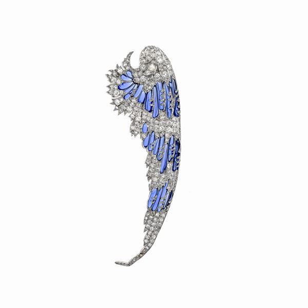Rara spilla modellata coma un' Ala in platino, diamanti e smalto blu attribuibile a Chaumet