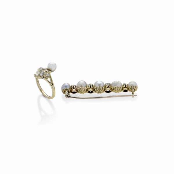 Spilla a barretta e anello in oro giallo, diamanti e perle