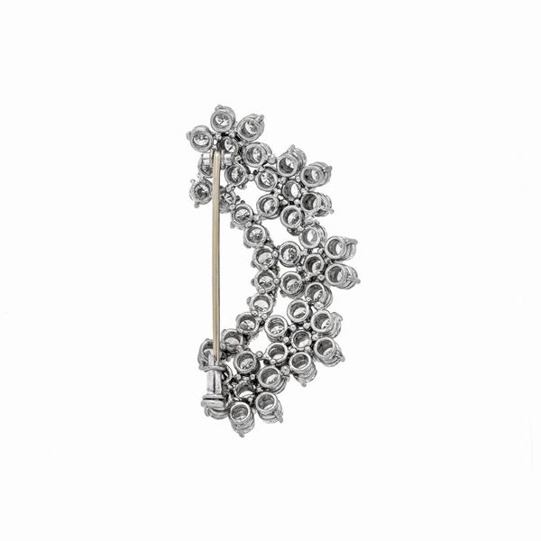 MATERIALE: oro bianco e diamanti DESCRIZIONE: spilla di ispirazione floreale, realizzata come una ghirlanda di fiori interamente impreziosite con diamanti taglio brillante MISURE: cm 4.5 x 2.5 PESO: diamanti ct 6.0, colore H-G, purezza VS, gr 11.7