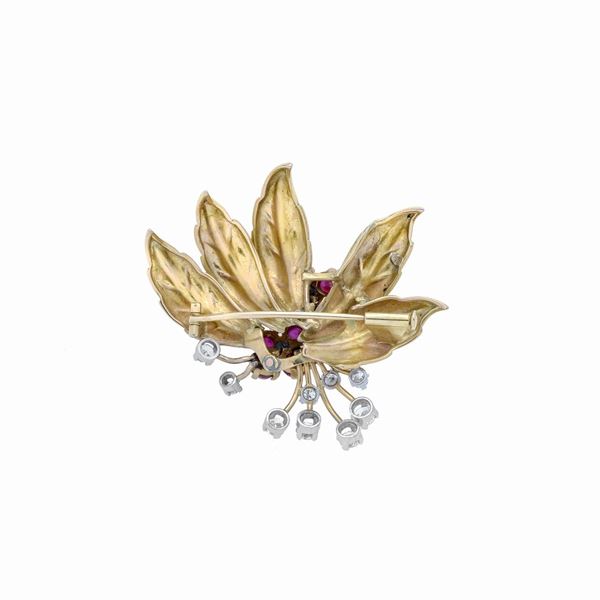 Spilla floreale in oro giallo, platino, diamanti e rubini