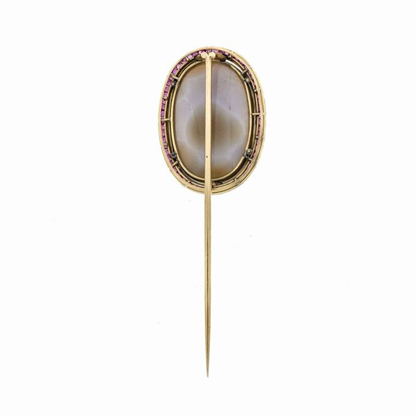 Spilla in oro giallo, smalto bianco, rubini e cammeo in agata