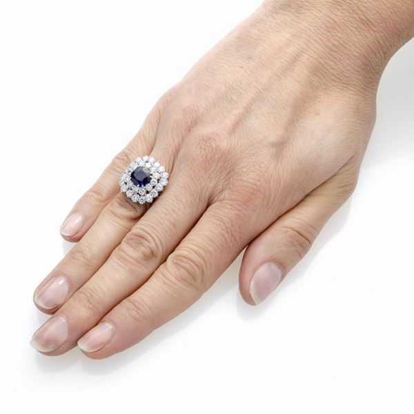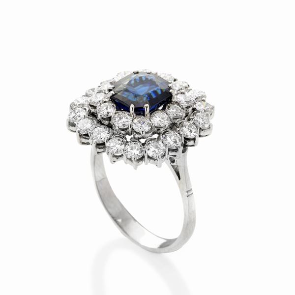 anello 15DESCRIZIONE: anello realizzato con uno zaffiro taglio ottagonale montato entro una doppia cornice a cuscino formata da due giri di diamanti taglio brillante PESO: zaffiro ct 1.70, diamanti ct 2.80, G, VS, g 6.8
