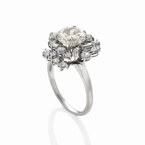 anello 13DESCRIZIONE: anello di forma esagonale realizzato con un diamante taglio brillante montato al centro di una cornice in diamanti taglio brillante e baguette PESO: diamante centrale ct 2.10 circa, colore P/Q, purezza VS, altri diamanti ct 0.80 circa, g 4.8