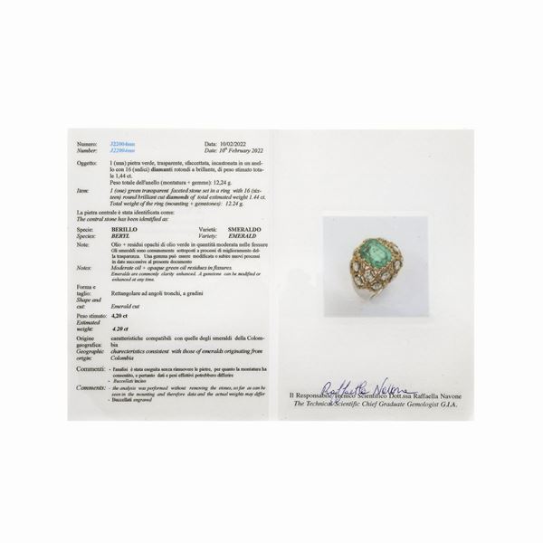 anello 12DESCRIZIONE: grande anello realizzato con smeraldo taglio rettangolare a gradini su alta base eseguita a tricot in oro giallo, impreziosita con sedici diamanti taglio brillante, fascia in oro bianco inciso, firmato Buccellati, reca il marchio 750 PESO: smeraldo colombiano ct 4.20, diamanti ct 1.44, gr 12.24, corredato di certificato RAG, Torino, num. J22004M, in data 10.02.2022.