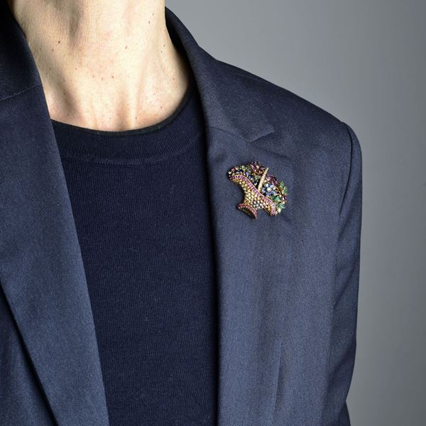 Anello in oro giallo, diamanti, smeraldi, rubini e braccialetto in oro giallo, perle e ambra