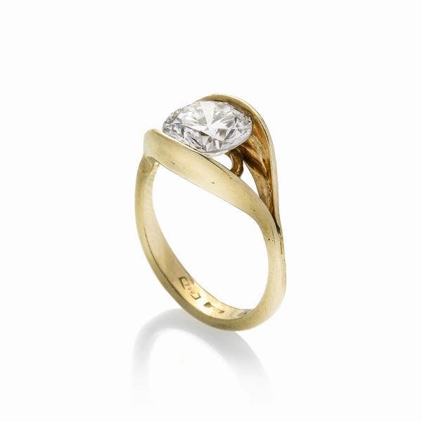 anello 17DESCRIZIONE: anello solitario in oro giallo realizzato con diamante taglio brillante montato tra due profili sagomati in oro giallo PESO: diamante di ct 3.0, colore H, purezza VS2, la pietra presenta un segno di trattamento con "Laser Drill" , gr 6.6
