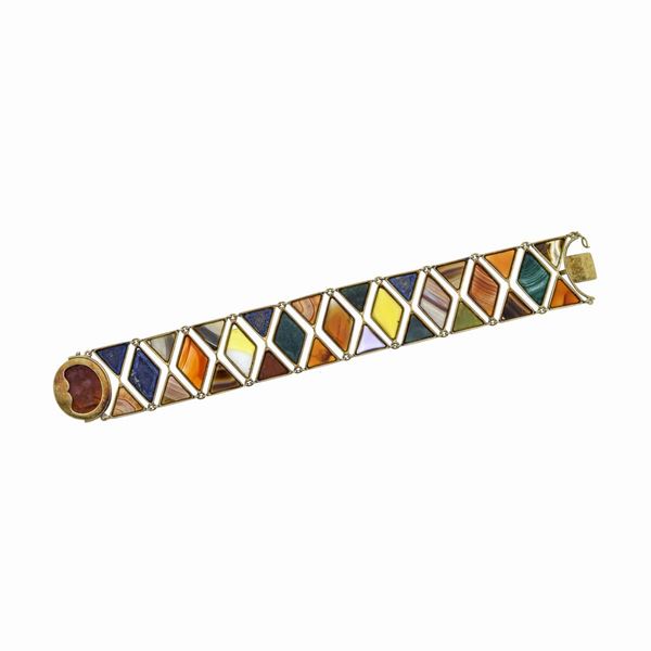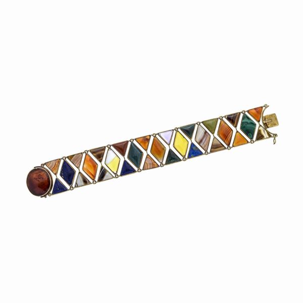 DESCRIZIONE: alto bracciale realizzato con placche triangolari e romboidali, ciascuna impreziosita con una pietra dura di colore diverso, corniola, lapislazzulo, quarzo rosa, occhio di tigre e malachite, una pietra leggermente scheggiata PESO: gr 45.9