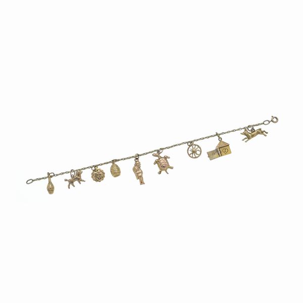 aperto lunghezza cm 20DESCRIZIONE: braccialetto realizzato con catena a maglie sagomate intrecciate tra loro, impreziosito con nove charms, ciascuno di forma diversa, sia porta fortuna sia raffiguranti animali, reca i marchi 750 PESO: gr 13.6