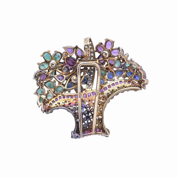 Clip a cestino in oro giallo, diamanti, rubini, zaffiri e smeraldi