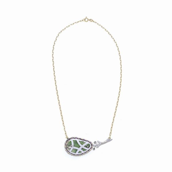aperta lunghezza cm 41DESCRIZIONE: collana eseguita con catena a maglie rettangolari e grande pendente realizzato come una foglia in giada, ornato da fiori interamente impreziositi con diamanti taglio vecchio e huit huit alternati a rubini, reca il marchio 750 PESO: diamanti ct 0.35 circa, gr 15.6