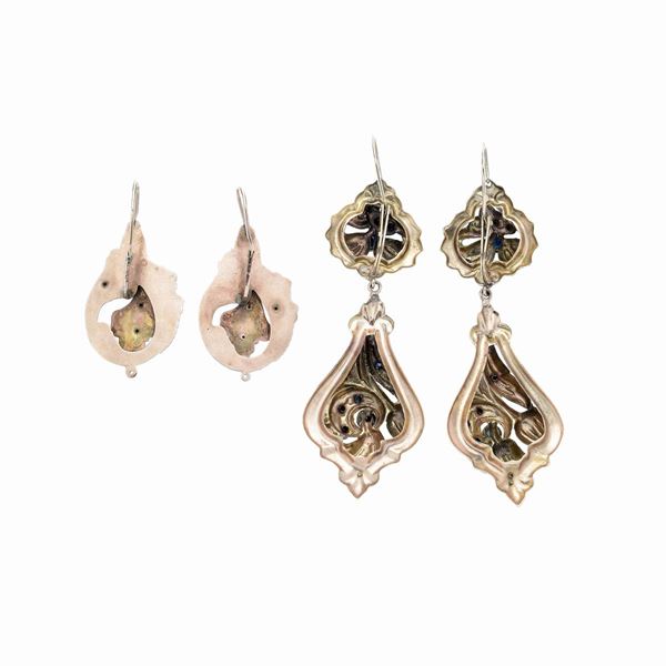cm 3 x 9 h e cm 2.4 x 5 hDESCRIZIONE: paio di lunghi orecchini pendenti, di ispirazione floreale, ciascuno realizzato come due foglie bombate impreziosite con piccoli zaffiri, ed un altro paio, più piccoli, impreziositi con smalti colorati, lievissimi difetti allo smalto, PESO: gr 23.6