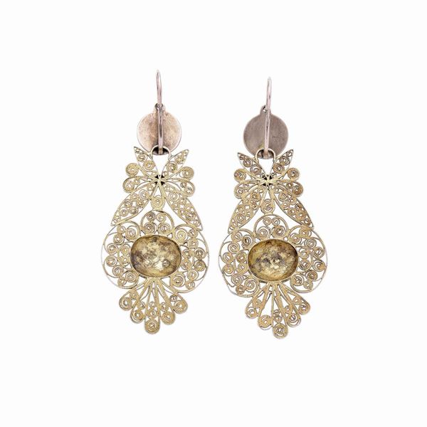 DESCRIZIONE: lunghi orecchini pendenti di ispirazione floreale, ciascuno realizzato in filigrana ad imitazione di un fiore e di foglie lanceolate PESO: gr 10.6