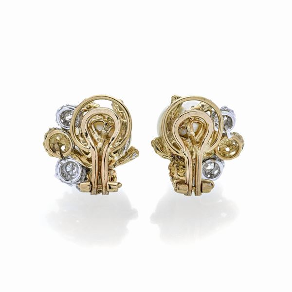 mm 17x17DESCRIZIONE: paio di orecchini realizzati ciascuno con una perla montata entro un castone asimmetrico in oro bianco ed oro giallo cesellato a corolle impreziosite da diamanti taglio brillante PESO diamanti ct 0.65 circa, gr 17.7
