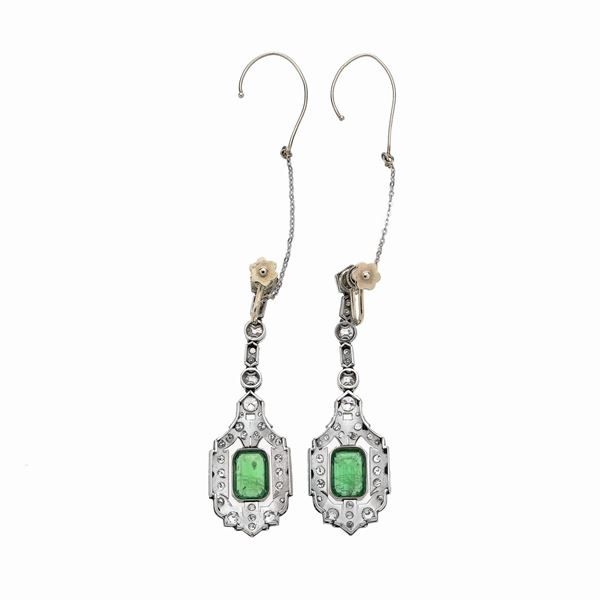 Paio di orecchini pendenti in platino, diamanti e smeraldi