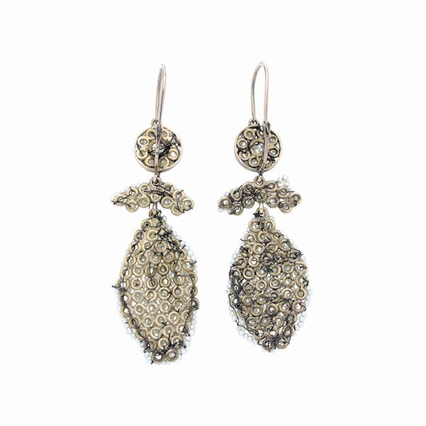 cm 1.6 x 6 hDESCRIZIONE: lunghi orecchini pendenti, ciascuno interamente impreziosito con microperle, lievi difetti PESO: gr 11.0
