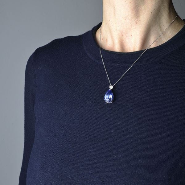 catena lunghezza cm 42.5, pendente cm 1.3x2.6 hDESCRIZIONI: catena realizzata a piccole maglie ad anello, pendente formato da un diamante taglio brillante montato a griffe al quale è sospesa una grande tanzanite taglio goccia PESO: tanzanite ct 12.26, diamante ct 0.48, g 7