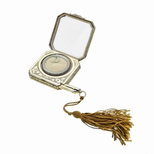 4.7x4.5, h cm 1DESCRIZIONE: piccola scatola ottagonale portacipria e portarossetto interamente incisa con girali di fiori e foglie lanceolate, all'interno specchio e vano portacipria, lateralmente vano portarossetto, reca il marchio 18 k. R. PESO: gr 60.2