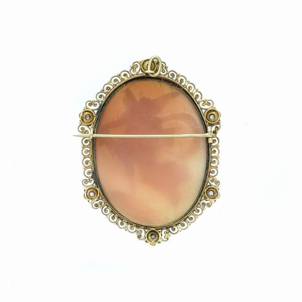 Spilla con Cammeo in conchiglia raffigurante Amore e psiche, oro giallo e diamanti
