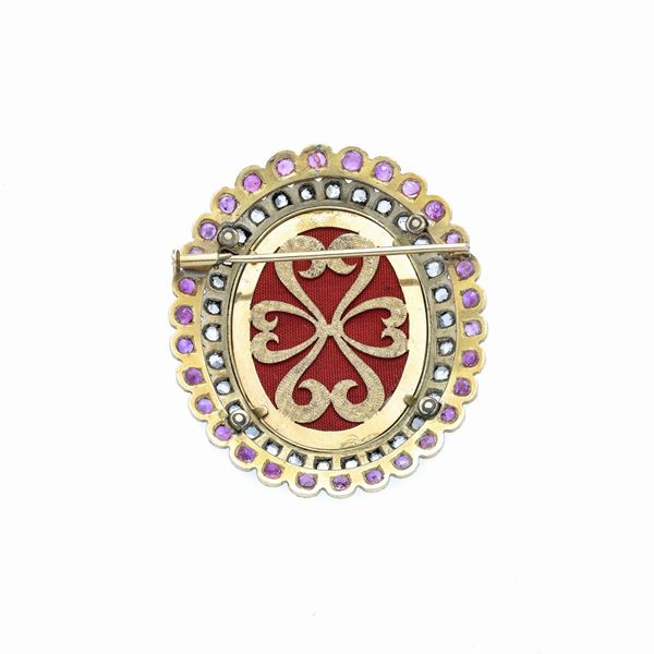 cm 4 x 4.6 hDESCRIZIONE: spilla ovale realizzata con miniatura raffigurante un ritratto di uomo in abiti orientali, firmata, incorniciata da una fascia lobata con rose di diamante ed un'altra con rubini PESO: gr 19.9