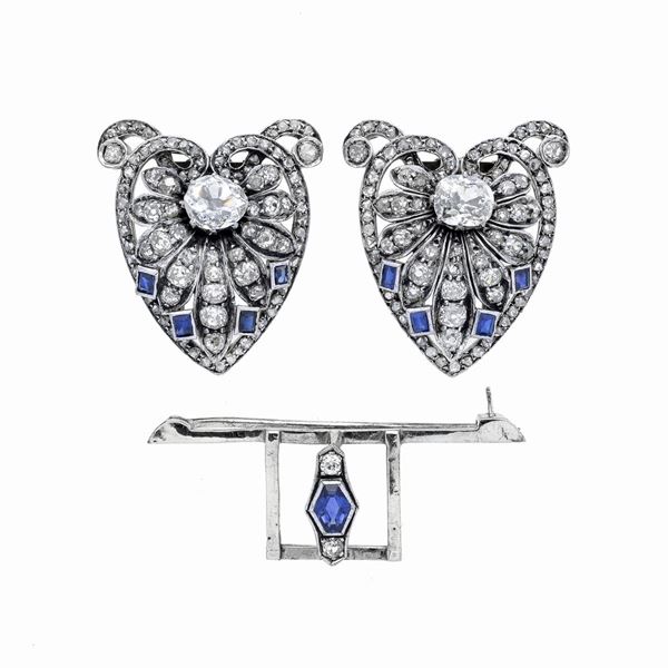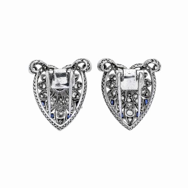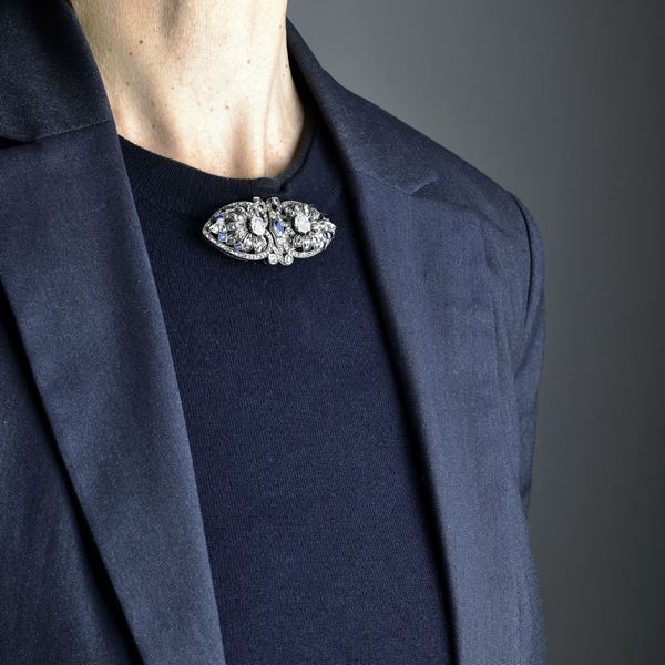 Spilla trasformabile in due clips in platino, zaffiri e diamanti