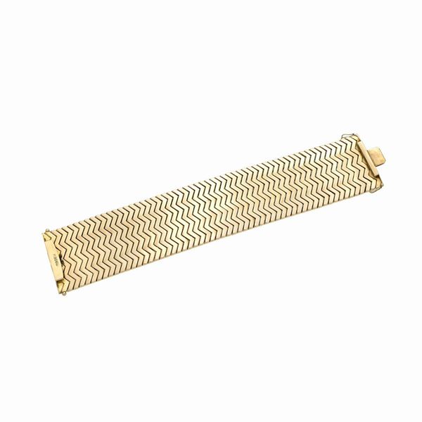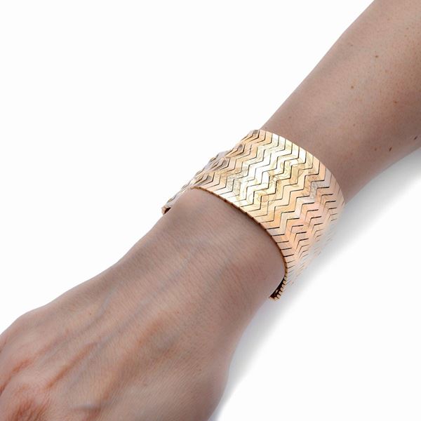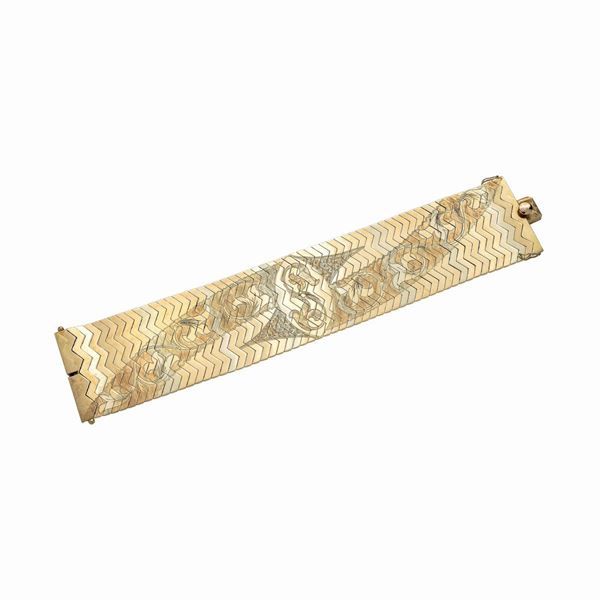 lunghezza aperto cm 20.5, altezza cm 4DESCRIZIONE: alto bracciale realizzato con maglie di ispirazione geometrica in diversi colori dell'oro, inciso con tralcio di volute contrapposte, reca il marchio 750 PESO: gr 100.5