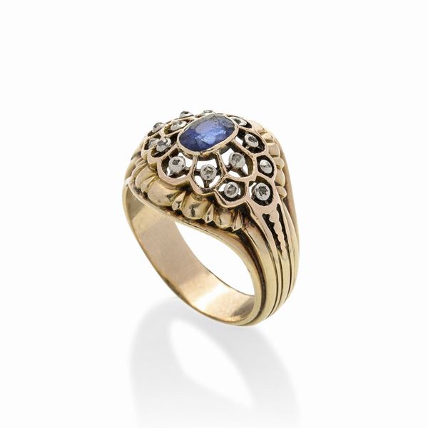 Anello a cupola in oro a basso titolo, argento, diamanti e zaffiro