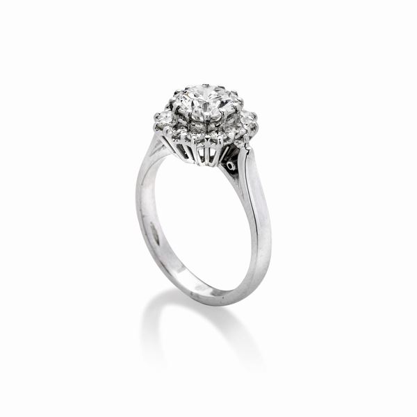 anello 10DESCRIZIONE: anello a margherita realizzato con diamante taglio brillante incorniciato con diamanti taglio brillante più piccoli, reca punzoni di difficile lettura PESO: diamante centrale ct 1.30, colore J, purezza VS1, diamanti laterali ct 0.40, colore G, purezza VS, gr 4.3