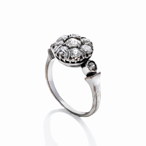 anello 14DESCRIZIONE: anello a margherita realizzato con diamanti taglio vecchio e due diamanti, sempre di taglio vecchio, disposti lateralmente PESO: diamanti ct ct 1.20, colore J/K, SI, gr 3.1
