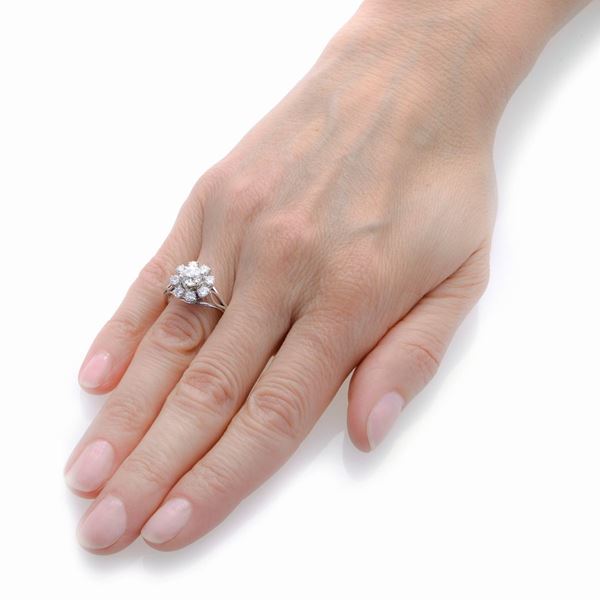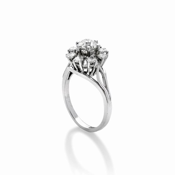 anello 16DESCRIZIONE: alto anello a margherita realizzato con diamante taglio vecchio incorniciato con otto diamanti di taglio brillante disposti su alta base, reca il punzone dell'oro francese PESO: diamante centrale ct 1.15, colore I-J, purezza VS, contorno diamanti ct 0.80, colore G, purezza VS, gr 5.4