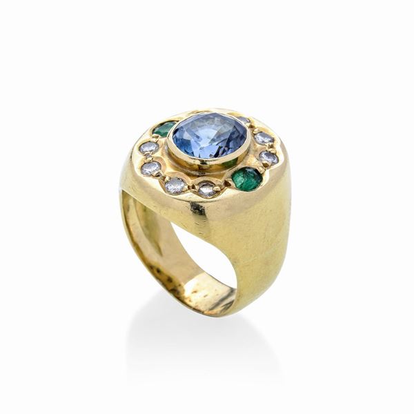 Anello a scudo in oro giallo, zaffiro chiaro, diamanti e smeraldo
