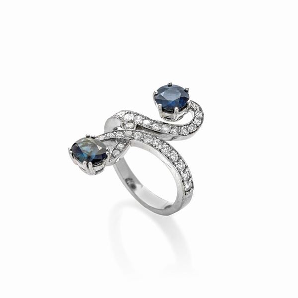 anello 13DESCRIZIONE: anello con montatura contrarié a volute impreziosite da diamanti taglio brillanti e da due zaffiri rispettivamente di taglio ovale e rotondo PESO: diamanti ct 0.50 circa, g 5.7