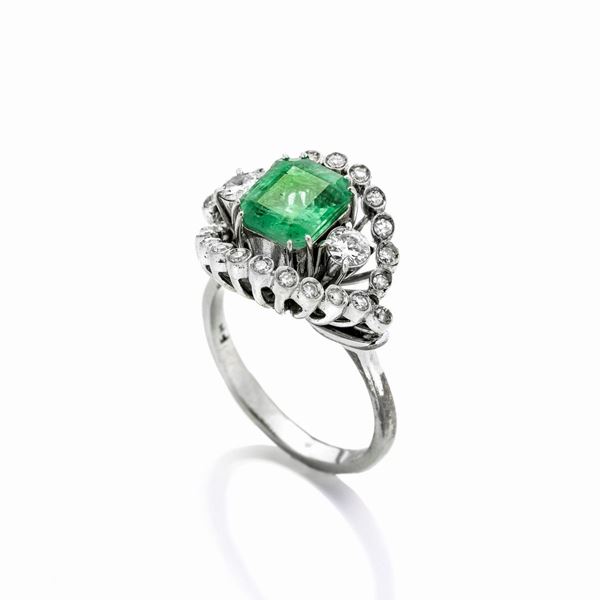 anello 10DESCRIZIONE: anello realizzato con smeraldo taglio rettangolare con due diamanti mezzo taglio ai lati, incorniciato da piccoli diamanti disposti a raggiera, reca un punzone di difficile lettura PESO: diamanti laterali ct 0.24, gr 5.3
