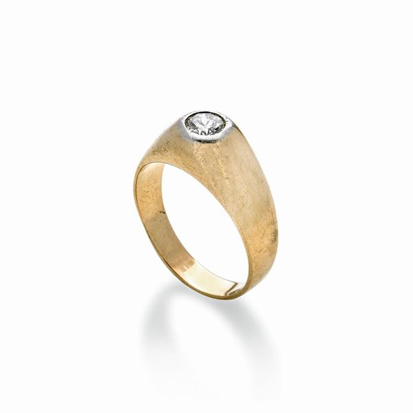 anello 23DESCRIZIONE: anello solitario con diamante mezzo taglio su alta base in oro giallo leggermente sagomata PESO: diamante ct 0.60, colore R/S, SI, gr 10.2