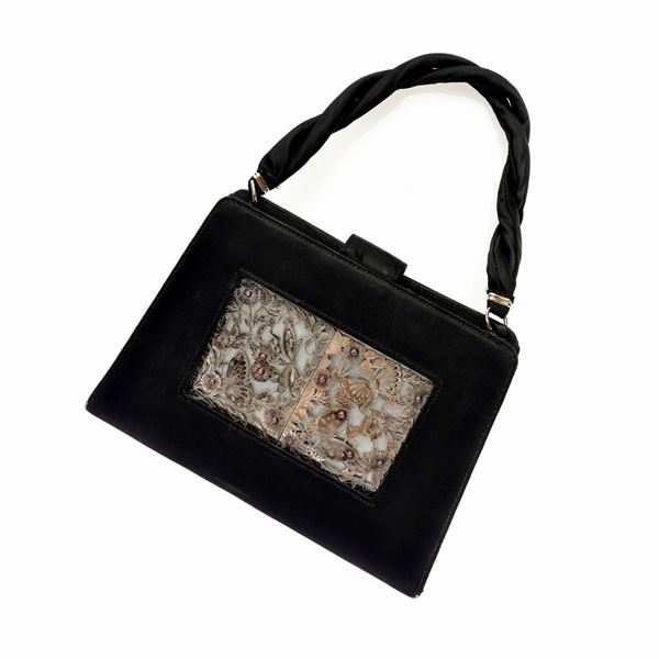 trousse cm 13x 8.5 x 2 h, rossetto h cm 5.3DESCRIZIONE: borsa da sera in raso di seta nero contenente trousse rettangolare, realizzata con coperchio in parte eseguito a tricot con motivi floreali, volute di foglie e farfalle, impreziosite con rubini taglio cabochon, apribile, contenente specchio e tre vani portatrucchi, corredata di rossetto en suite, firmata J. Lacloche - Paris - Cannes PESO: 542.6 gr