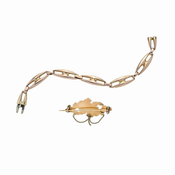 Bracciale a maglie e spilla in oro a basso titolo e corallo rosso