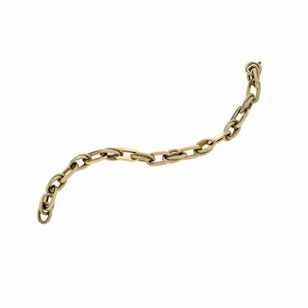 aperto cm 22.5DESCRIZIONE: bracciale realizzato ad una fila di maglie ovali intercalate da doppi anelli ovali in oro satinato, punzone 750 PESO gr 20.7