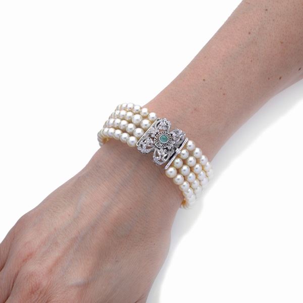chiuso diametro interno cm 6DESCRIZIONE: bracciale rigido realizzato con quattro fili di perle coltivate, fermezza, di ispirazione floreale, centrata da smeraldo e impreziosita con diamanti taglio huit huit, reca il marchio 750 PESO: gr 53.1