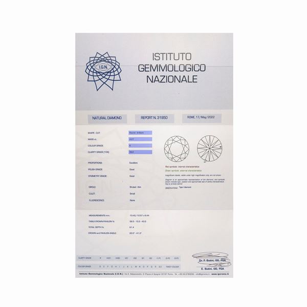 DESCRIZONE: Diamante taglio brillante ct 4.27, colore K, purezza VS2, corredato di certificato IGN Roma num. 31950 DEL 17.05.2022