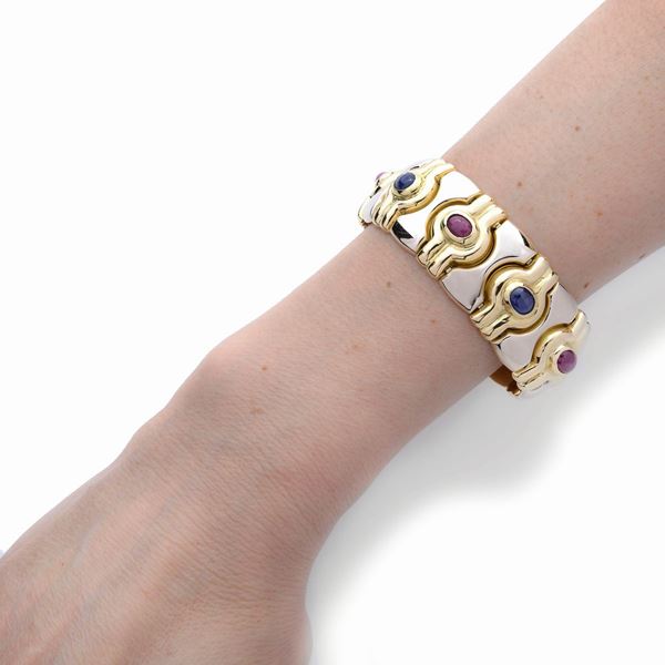 Grande bracciale rigido in oro giallo, oro bianco, zaffiro e rubini