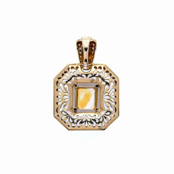 cm 4 x 5.5 hDESCRIZIONE. grande pendente, di ispirazione geometrica, realizzato con anello impreziosito con diamanti taglio baguette degradè, quarzo citrino di taglio rettangolare illuminato con diamanti taglio brillante in cornice ottagonale di cristallo di rocca, reca il marchio 750 PESO: gr 43.8