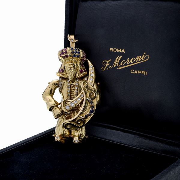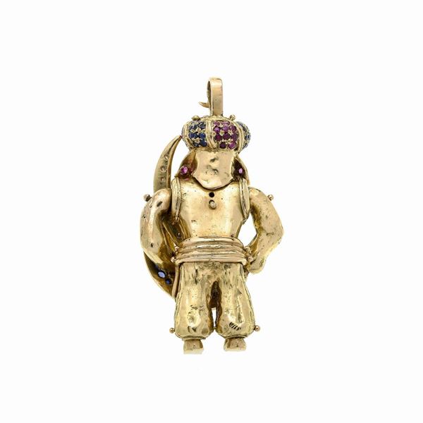 cm 4 x 7.5 hDESCRIZIONE: grande pendente, snodabile, realizzato a tutto tondo come un Saraceno con scudo e scimitarra, impreziosito con zaffiri, rubini e diamanti taglio brillante e huit huit, firmato Moroni, reca il marchio 750 PESO: diamanti ct 0.80, colore H, VS, rubini ct 0.90, zaffiri ct 0.70, gr 96.2